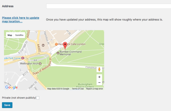 Type in the address with commas and click Please click here to update map location... The map will then show the rough location with a marker which can be dragged and dropped to the right address. This allows the exact latitude and longitude to be saved so that maps can be shown on the address list shortcodes.